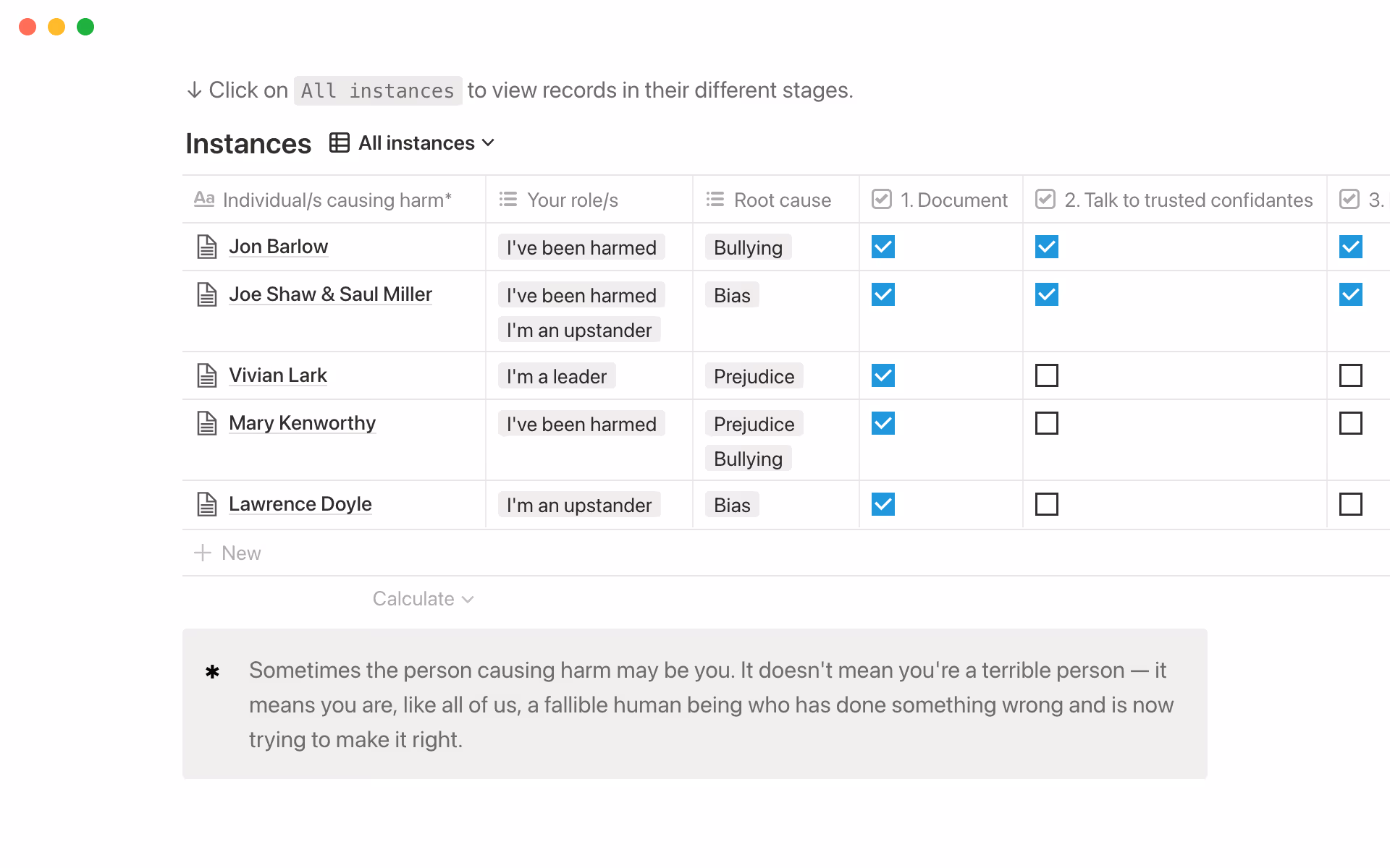 Track the actions you’ve taken for each instance by using checkboxes in the database to keep a clear record of your progress. You can also see at a glance which instances you’ve shared publicly or reported to HR in separate filtered views.