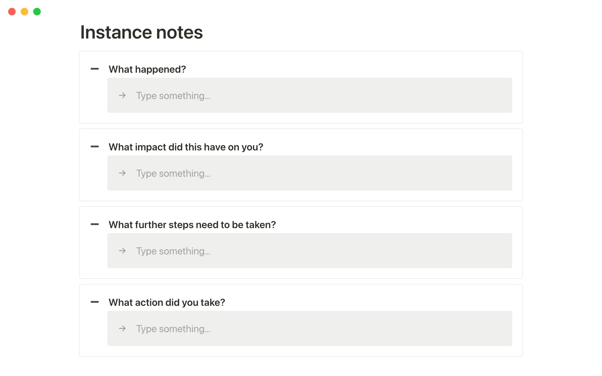 Responding to any type of injustice is never an easy task. For every instance, answer pre-made questions from Kim's framework to confidently craft a response and share with those involved. Or if you didn't know how to react, use this space to log what happened so you can take action in the future.