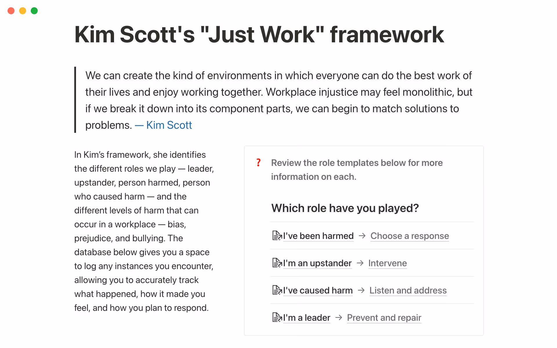 Bestselling author Kim Scott, who's helped hundreds of teams communicate better through Radical Candor, has partnered with veteran Chief People Officer Trier Bryant to tackle these injustices with their new Just Work framework. Put it into practice with her Notion template, which includes practical steps to log any injustices you encounter, identify your role, plan your response, and push your team toward a fair outcome.